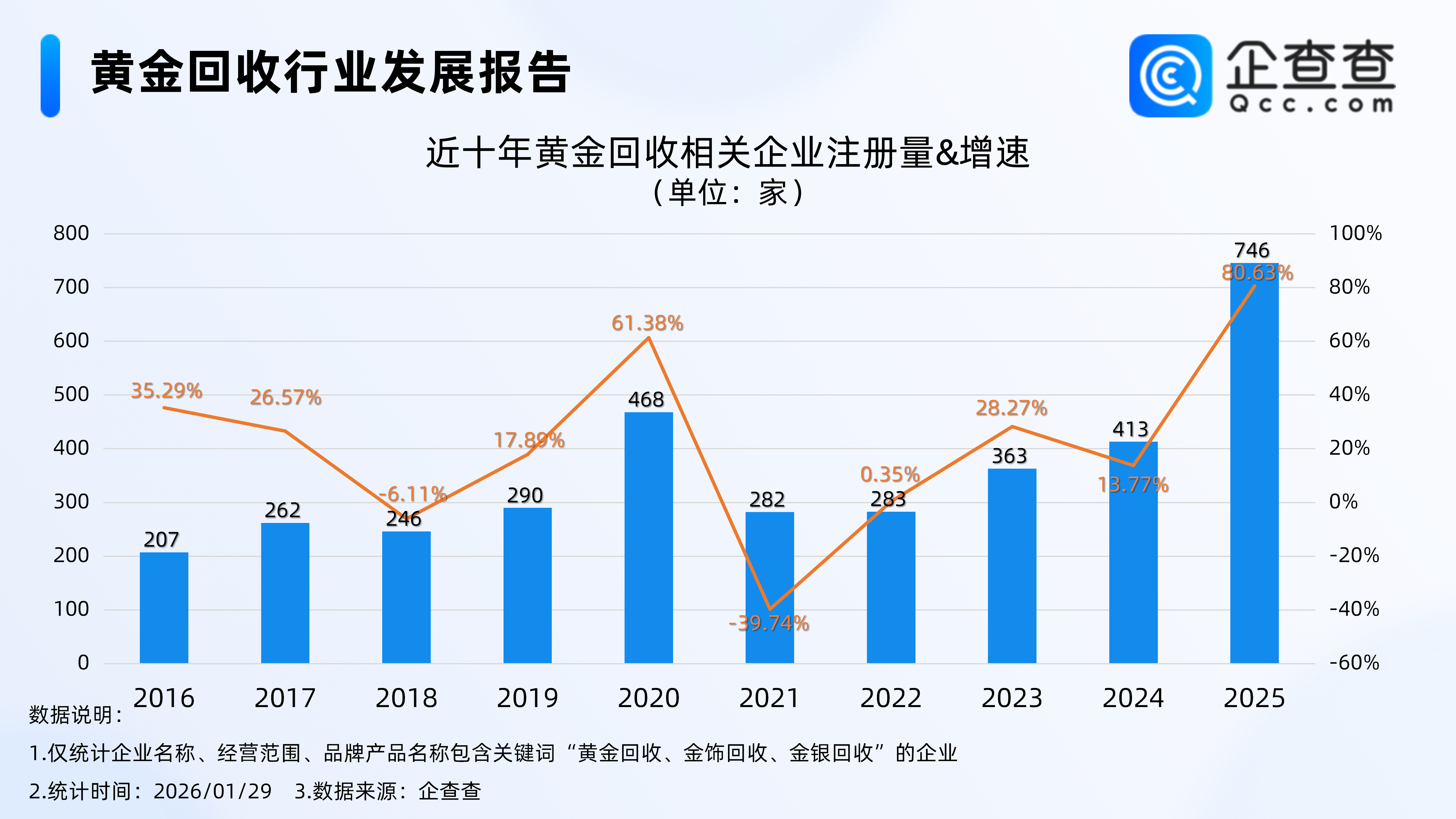 据央视财经报道,最近黄金价格上涨迅猛,不断刷新纪录。在广东深圳水贝市场一家从事黄金回收的门店内,不时有消费者前来出售黄金。有消费者表示,现在回收价超1100元。工作人员介绍,面对金价飙涨,不少手里有黄金的消费者选择把黄金变现,这让他们的回收量大大增加。黄金回收业务也吸引了二手交易平台加入。一家专门从事数码产品回收业务的二手交易平台,2025年下半年也开始布局黄金回收业务,他们的黄金回收业务在近期也创下了新高。企查查数据显示,截至1月29日,国内现存黄金回收相关企业2913家。近十年相关企业呈整体增长态势,2025年全年注册量同比快速增长80.63%至746家黄金回收相关企业,创近十年注册量及增速双峰值。截至目前,今年已注册69家相关企业。存量方面,从经营时间来看,成立年限在1年内的黄金回收相关企业最多,占比25.23%。从地区分布来看,分布在华南地区的黄金回收相关企业最多,占比37.25%。1.2025年创近十年注册量及增速双峰值