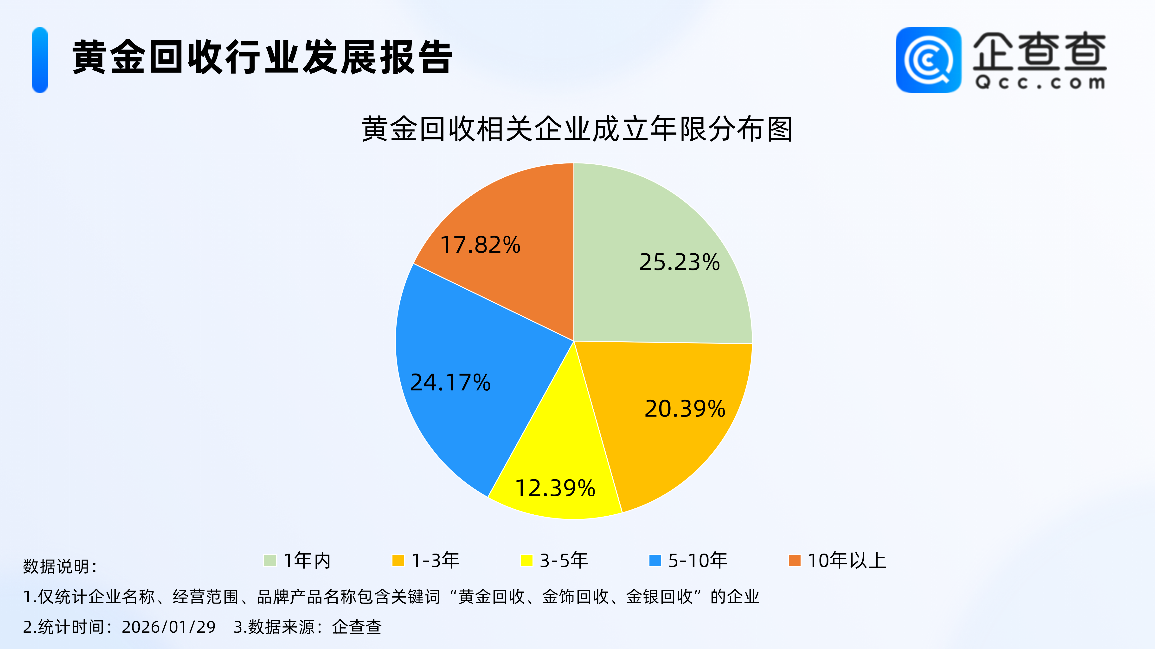 企查查数据显示,截至1月29日,国内现存黄金回收相关企业2913家。近十年相关企业呈整体增长态势,其中2020年全年注册量同比增长61.38%至468家相关企业,达第一个注册量峰值。2025年全年注册量同比快速增长80.63%至746家黄金回收相关企业,创近十年注册量及增速双峰值。截至目前,今年已注册69家相关企业。2.成立年限在1年内的相关企业最多
