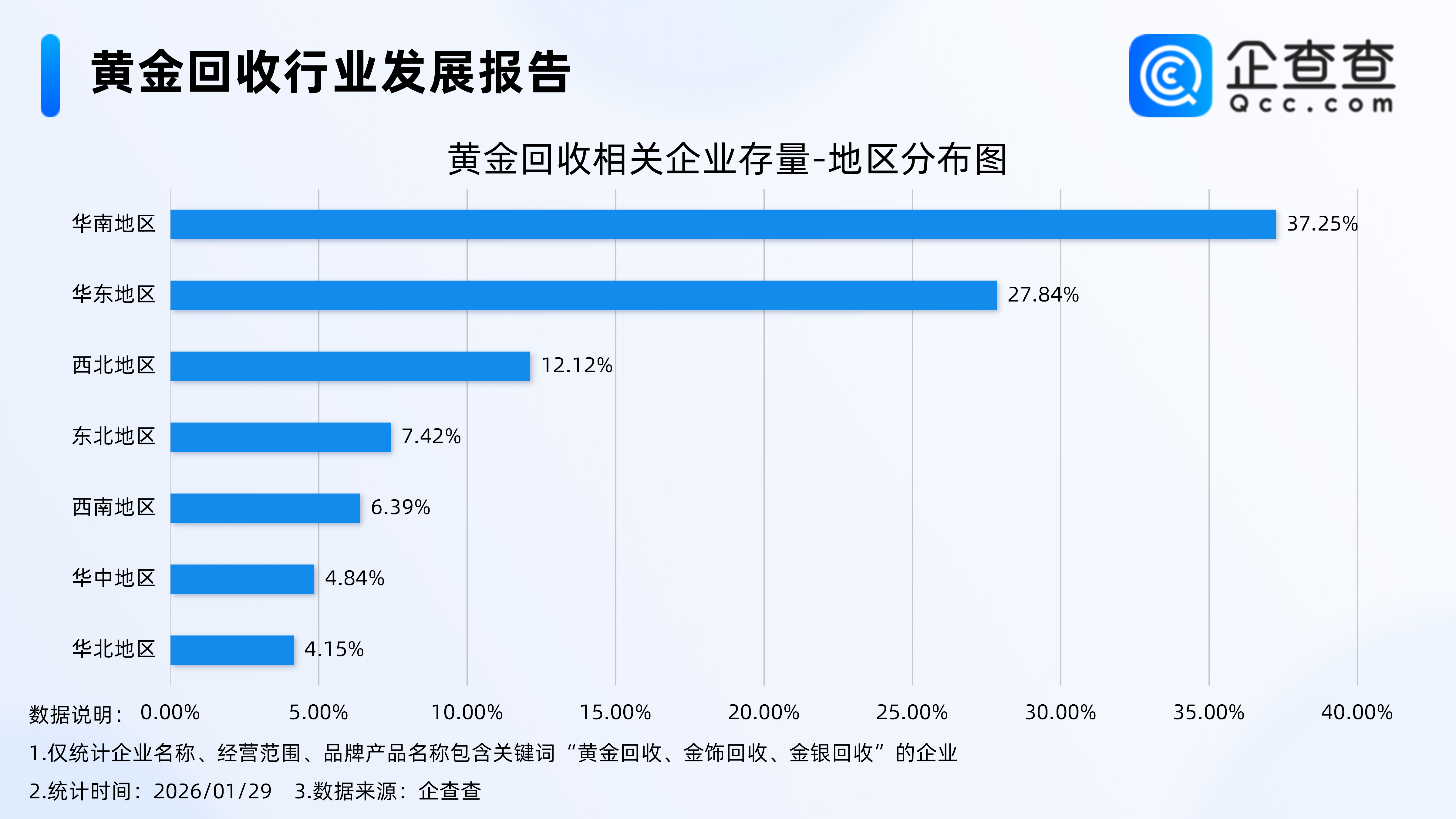 企查查数据显示,从地区分布来看,分布在华南地区的黄金回收相关企业最多,占比37.25%。其次,分布在华东地区、西北地区的相关企业分别占比27.84%、12.12%。其余地区占比均不足10%。